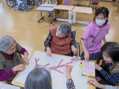 コロナウイルスの影響で行事が軒並み中止となってしまっていますが、「なにか活動がしたい」とのご意見をいただき。貼り絵を作成しました。「ここどうするの?」「どこに貼ろうか?」等和気あいあいと作成されていました。完成しフロア内に貼ると、「きれいだねー」と周りの方々から感想をいただきました。