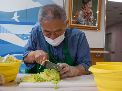 2階フロアで、焼きそばの会を行いました。久々の料理の機会に皆様笑顔です。料理のプロの華麗な包丁さばきもあり、とても美味しく出来上がりました。